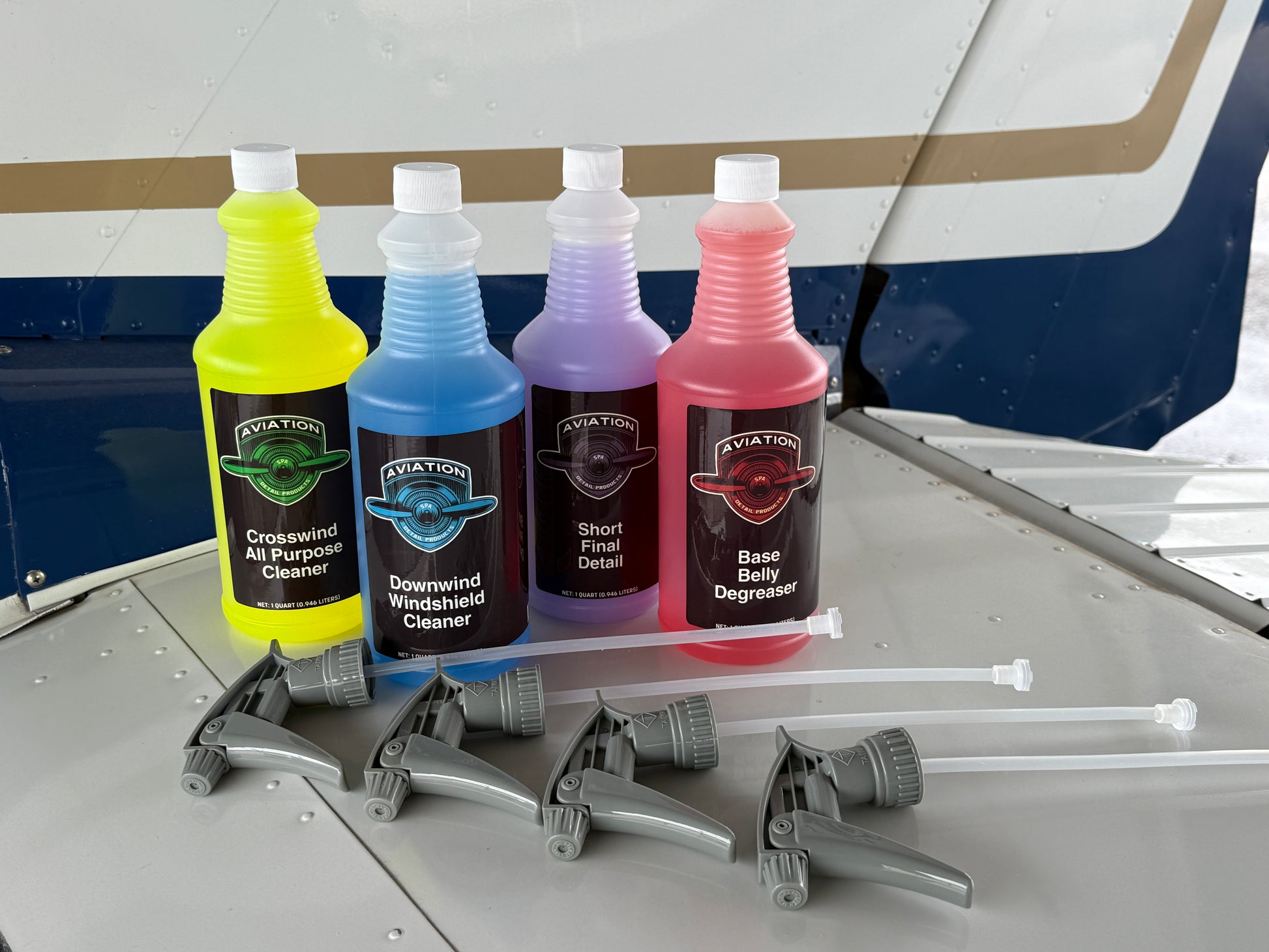 Premium cleaning products specifically formulated for use on aircraft. Carry in your baggage compartment and clean the bugs off when you get to your destination. Have a few more minutes to spare clean the belly and windshields with ease. Spray on wipe off the oil residue, smoke oil residue, and windshield bugs, dust, and dirt. These products are designed to wash away bugs, oil and dirt on every surface of your aircraft without the need for water.